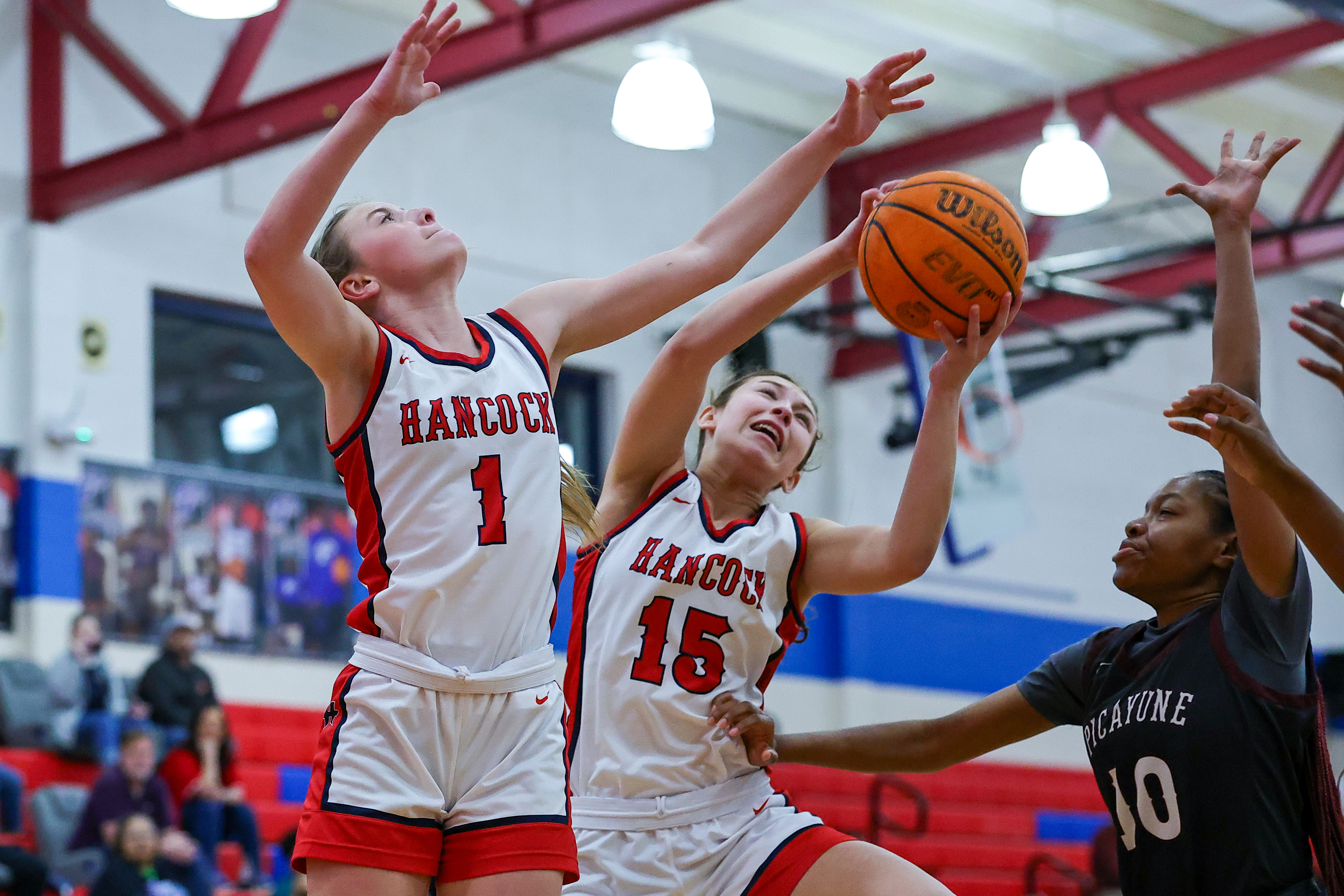 Hancock’s Lexi Dreher and Jaleigh Garriga (15) scramble for a rebound with Picayune’s Madilyn Plummer Friday night. (Photo by Bobby McDuffie)Hancock’s Jaleigh Garriga makes a move towards the basket vs. Picayune Friday night. (Photo by Bobby McDuffie)Hancock’s Jaleigh Garriga grabs a rebound as Picayune’s Dejean Raine (5) and Carleigh Gullotte react Friday night. (Photo by Bobby McDuffie)Hancock’s Lexi Dreher heads toward the lane as Picayune’s Laikyn Moore defends Friday night. (Photo by Bobby McDuffie)Hancock’s Paityn Langley looks for some working room as Picayune’s Devin Adkins defends Friday night. (Photo by Bobby McDuffie)