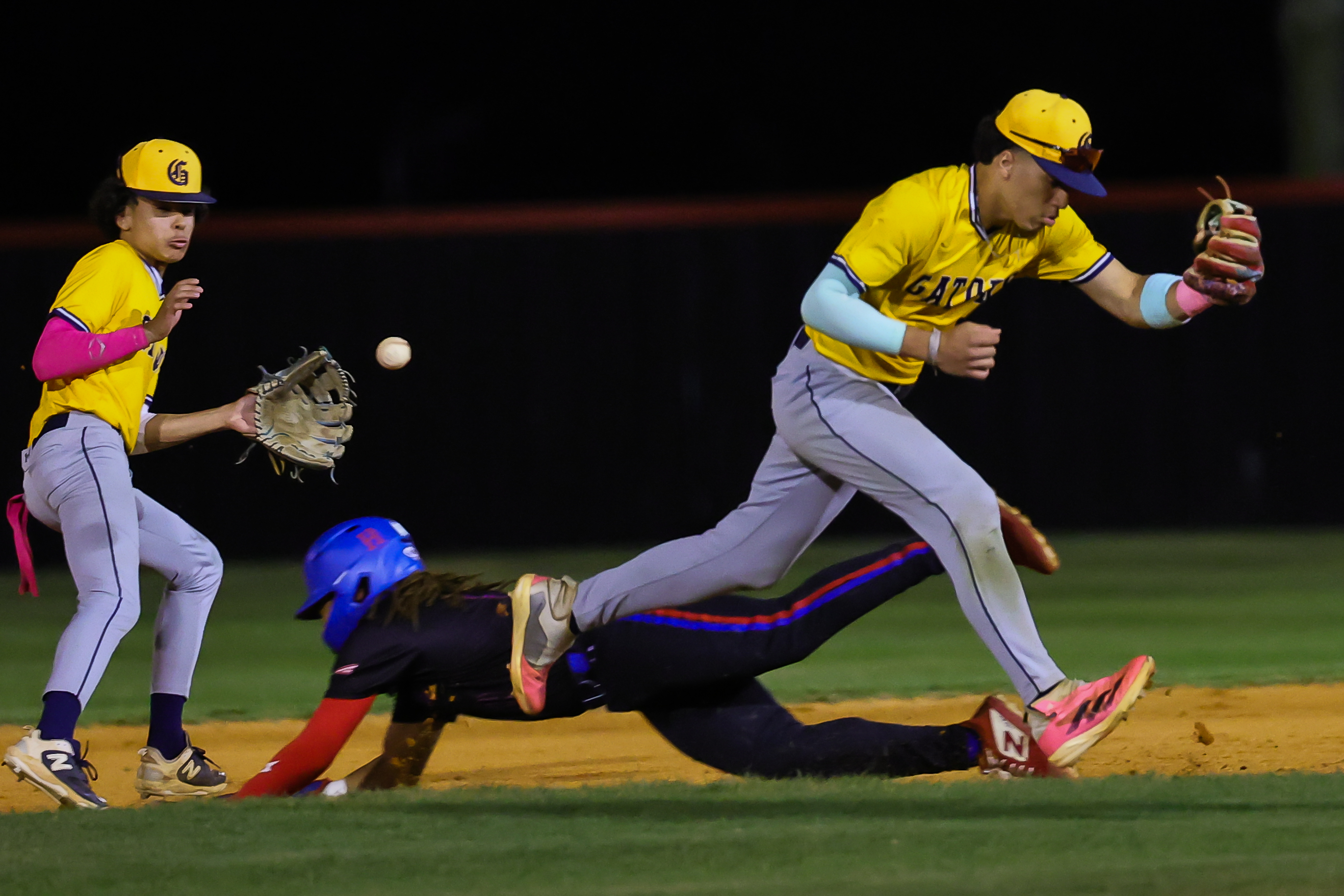 Gautier pitcher Darrie Slay takes aim on home plate vs. Pascagoula Thursday night. (Photo by Bobby McDuffie)Pascagoula infielder Matt Dittsworth makes a play on a ground ball vs. Gautier Thursday night. (Photo by Bobby McDuffie)The ball bounces between Gautier infielders Robert Fernandez (left) and Herrion Figueroa as Pascagoula base runner Steven Avila slides into second Thursday night. (Photo by Bobby McDuffie)Gautier infielder Robert Fernandez makes. play on a ground ball vs. Pascagoula Thursday night. (Photo by Bobby McDuffie)